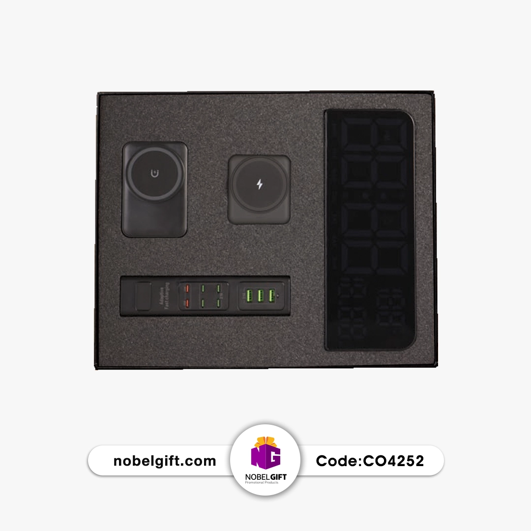 این مجموعه شامل ساعت رومیزی دیجیتال، پاوربانک فست شارژ 10000 میلیآمپر، شارژر استندی وایرلس و هاب شارژ USB بوده و در یک جعبه لوکس هاردباکس ارائه میشود. طراحی مینیمال و هماهنگ اجزا، جلوهای شیک و مدیریتی به این ست بخشیده است.