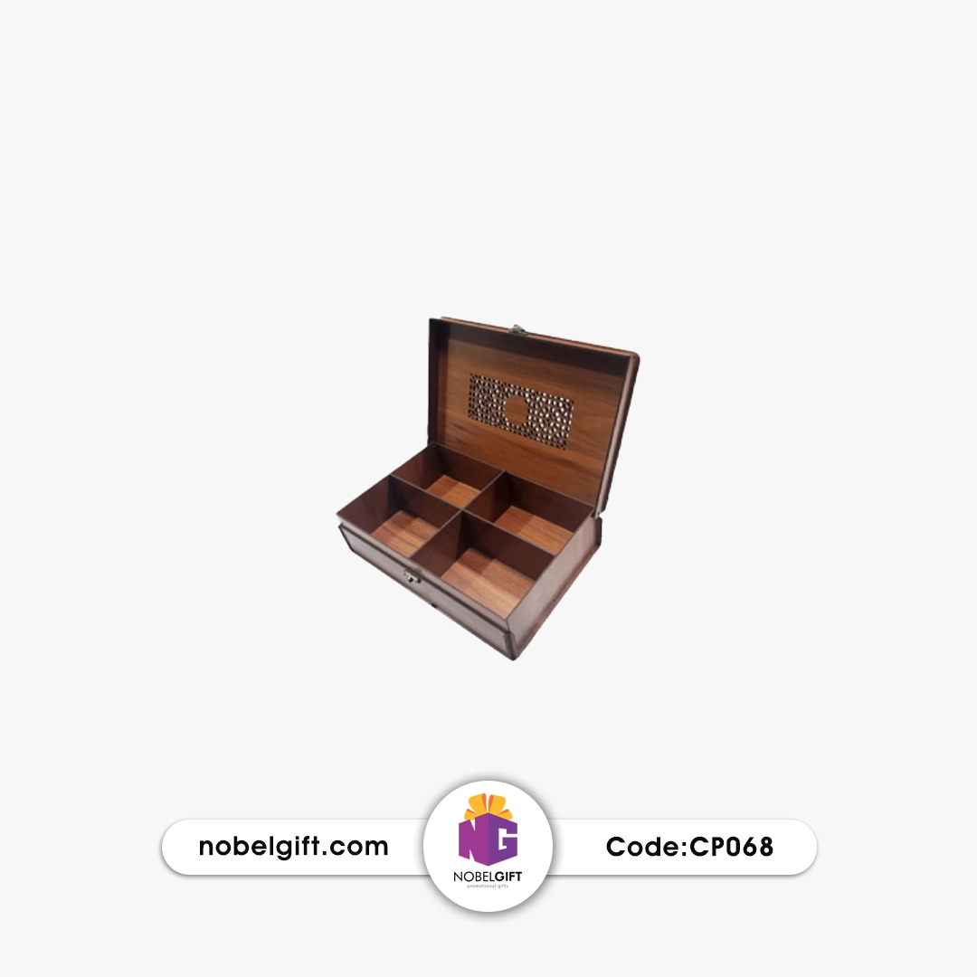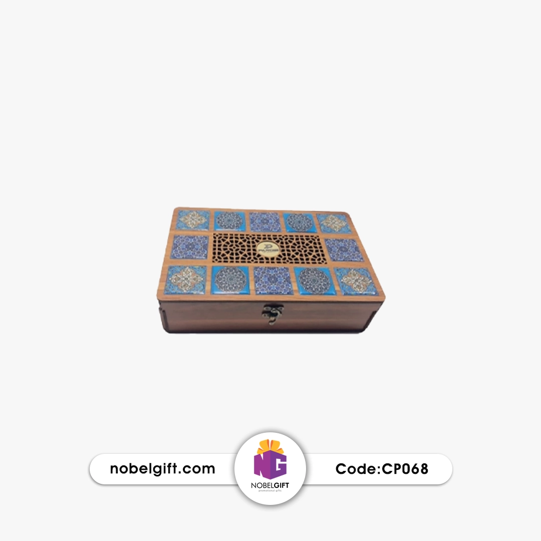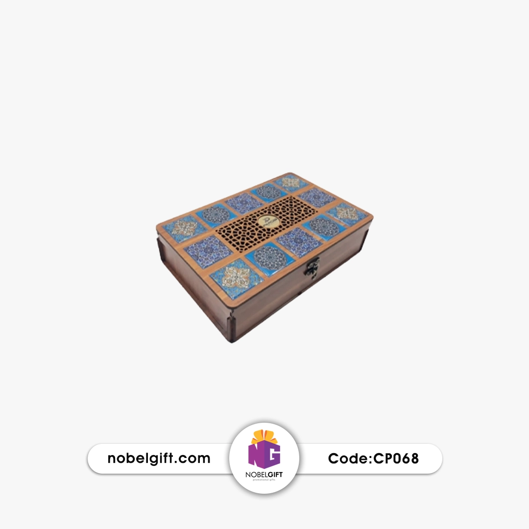 جعبه پذیرایی با پلاک لوگو CP068 یک گزینه‌ی شکیل، کاربردی و چشم‌نواز برای سرو تنقلات، آجیل یا شکلات است. این جعبه با طراحی سنتی و وجود ۱۲ کاشی مینیاتوری دست‌ساز روی درب آن، حس اصالت و زیبایی را القا می‌کند. وجود پلاک طلایی برای نصب لوگوی اختصاصی آن را به انتخابی ویژه برای هدایای تبلیغاتی تبدیل کرده است.