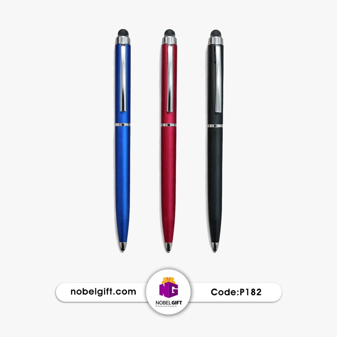 - این خودکار تبلیغاتی کد P182 از محصولات نوبل گیفت (nobelgift.com) است؛ مدل پیشرفتهتری نسبت به P180 و P181، با ویژگی نوک لمسی (stylus tip) برای استفاده روی صفحه نمایش موبایل، تبلت و تاچاسکرینها – ترکیبی عالی از خودکار نوشتاری + ابزار دیجیتال.