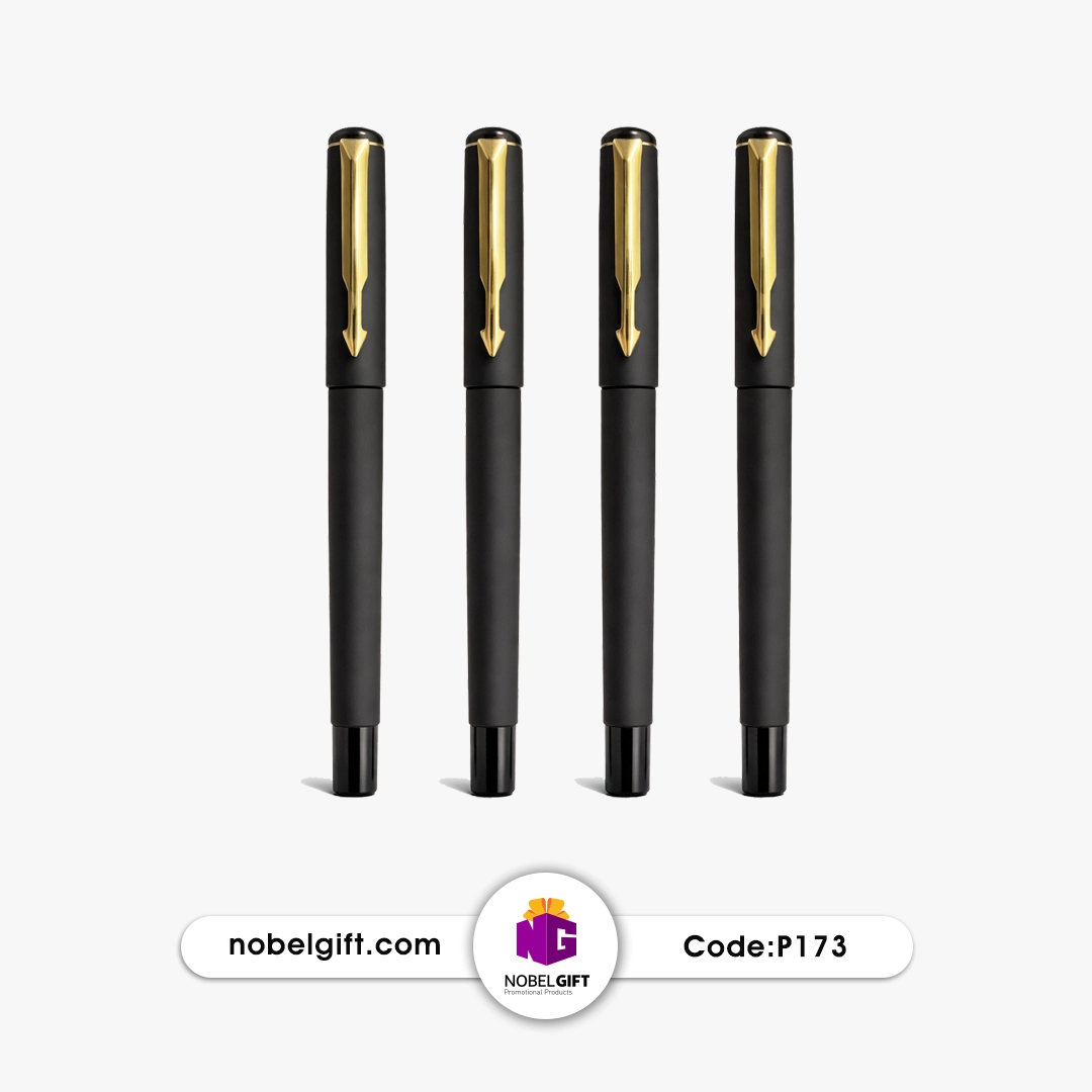 - خودکار فلزی تبلیغاتی مات مشکی با جزئیات طلایی لوکس