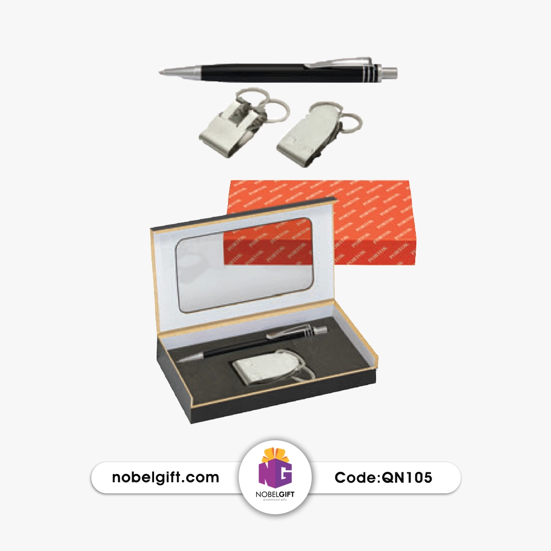 ست خودکار و جاکلیدی تبلیغاتی QN105 با طراحی منحصربهفرد و بسته بندی ویژه در کنار کیفیت و زیبایی، هدیهای شیک و مناسب جهت تقدیم به افراد است. این ست تبلیغاتی شامل محصولات زیر می باشد:
