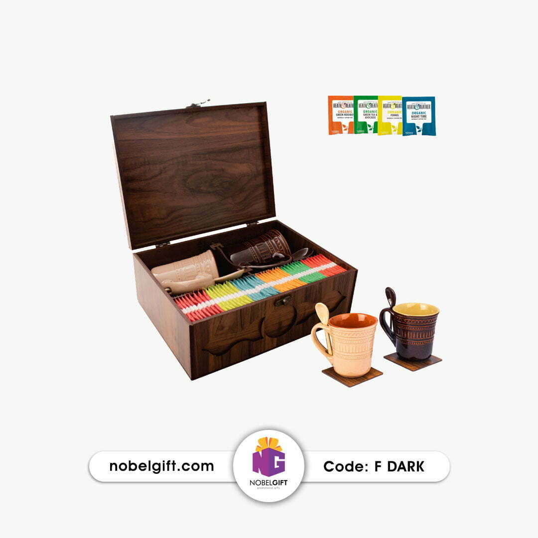 - جعبه پذیرایی چوبی/ زیر لیوانی چوبی/ دو عدد فنجان قاشق دار و دمنوش
