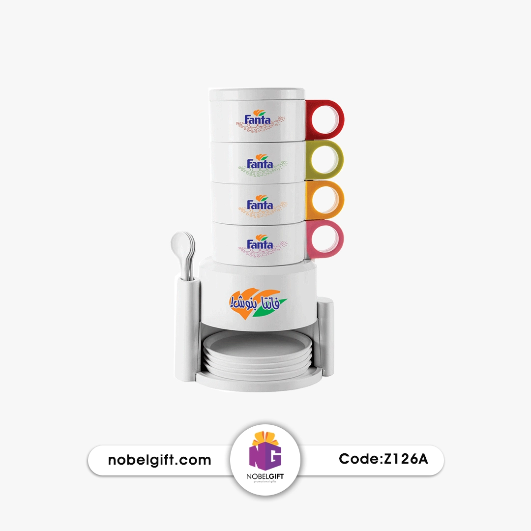 - این ست به دلیل امکان چاپ لوگوی اختصاصی (مانند برند Fanta در تصویر) روی فنجانها و استند، یک هدیه تبلیغاتی با تأثیر بصری بالا و کاربرد روزانه است.