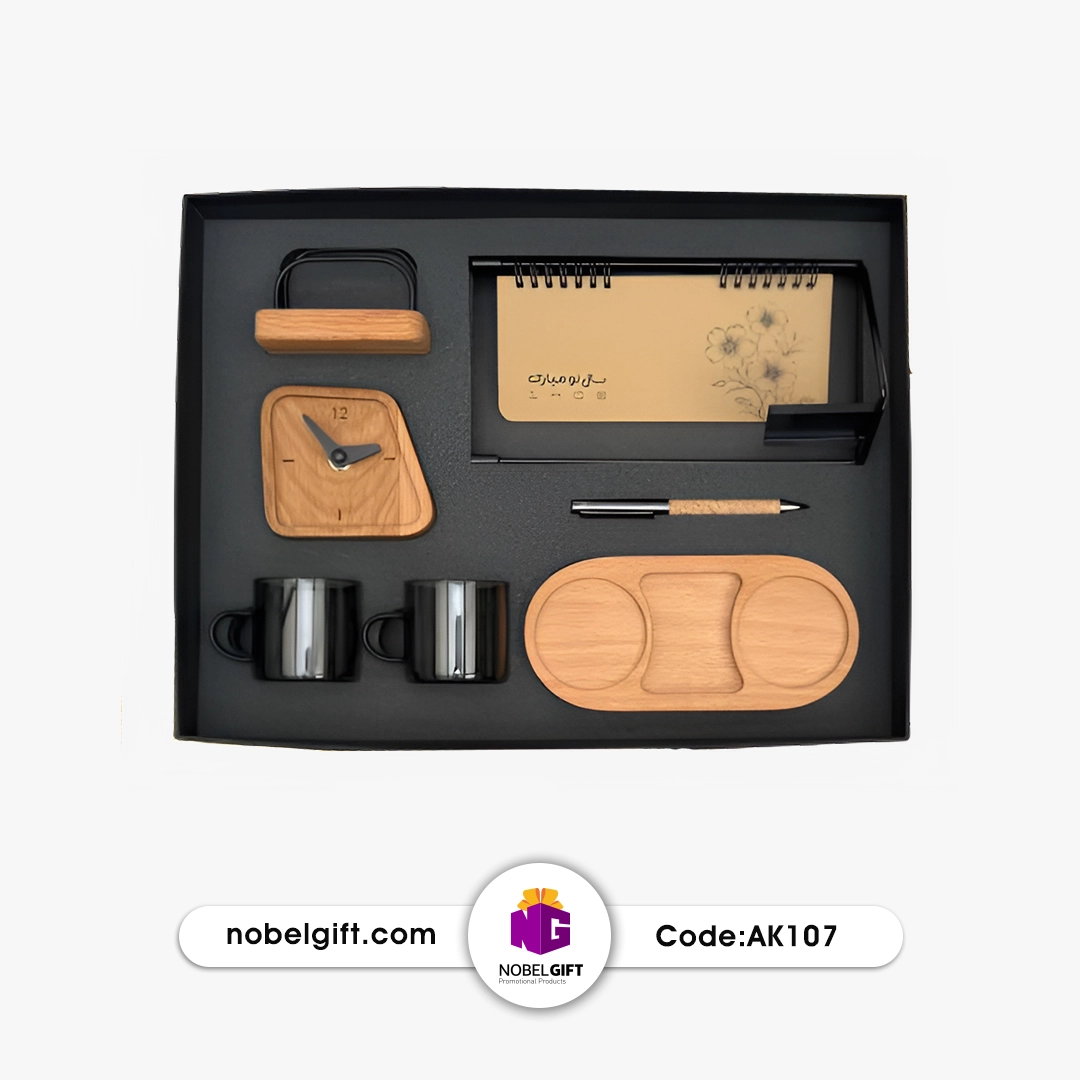 1. این ست یکی از کامل‌ترین و متنوع‌ترین مدل‌های سری AK (چوبی پیشرفته و مدیریتی) نوبل گیفت است که با ترکیب عناصر چوبی طبیعی گرم  و اقلام کاربردی روزمره، حس لوکس، اصالت، گرما و حرفه‌ای بودن می‌دهد.
