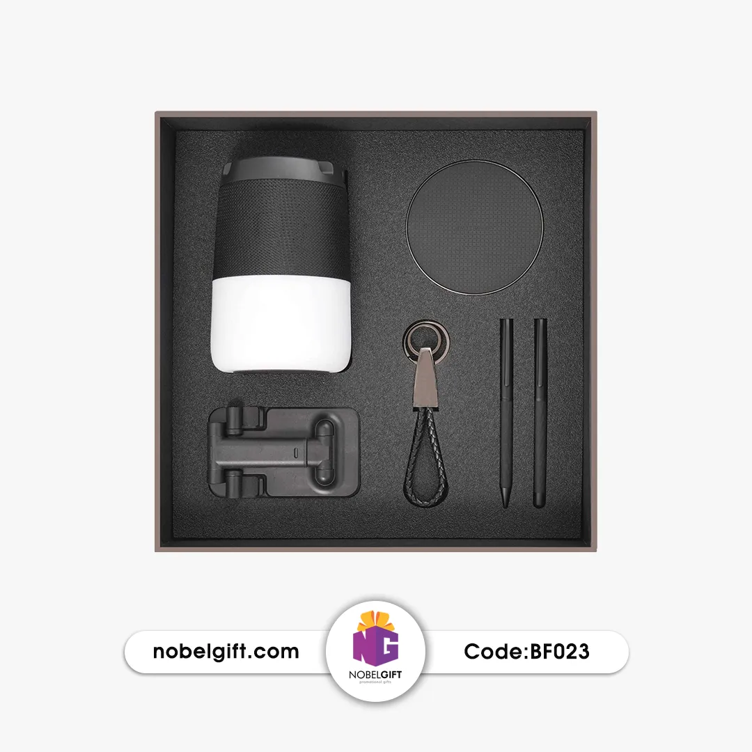ست مدیریتی تبلیغاتی کد BF023 با طراحی منحصربفرد، بسته بندی هاردباکس و رنگ بندی مشکی در کنار کیفیت و زیبایی محصولات، هدیه ای شیک و مناسب جهت تقدیم به مدیران است. این ست مدیریتی شامل 5 محصول زیر می باشد: