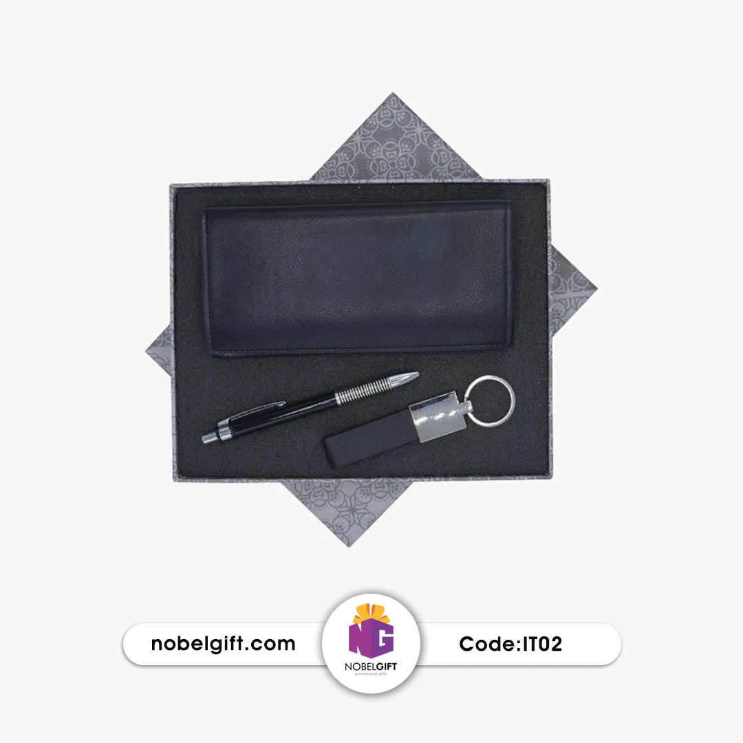 - ست کیف پول و خودکار و جاسوئیچی چرم و فلز