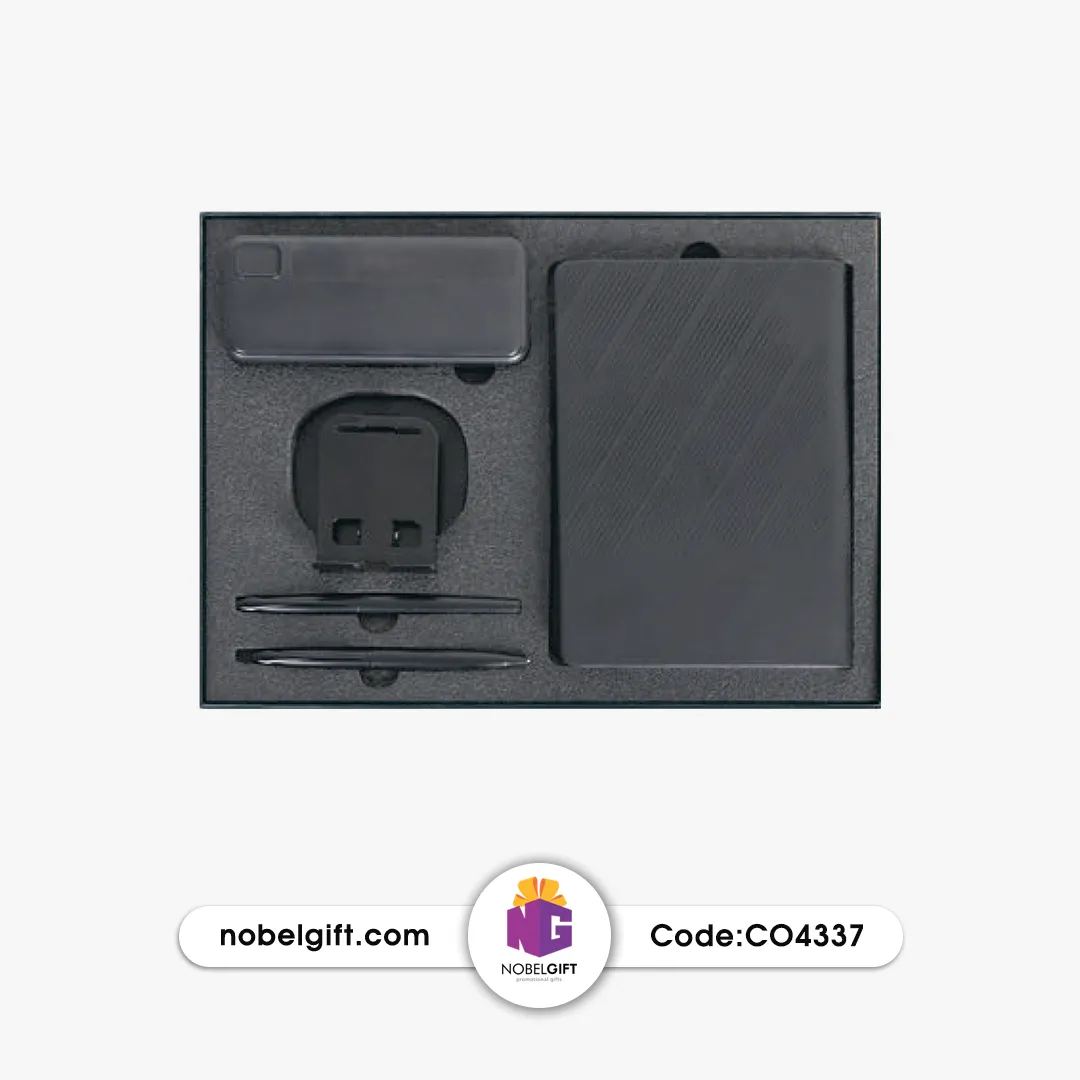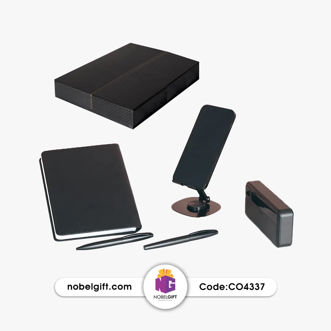 ست مدیریتی مشکی 4 تکه تبلیغاتی با طراحی منحصربفرد، بسته بندی هاردباکس و رنگ بندی مشکی در کنار کیفیت و زیبایی محصولات، هدیه ای شیک و مناسب جهت تقدیم به مدیران است. این ست مدیریتی شامل 4 محصول زیر می باشد: