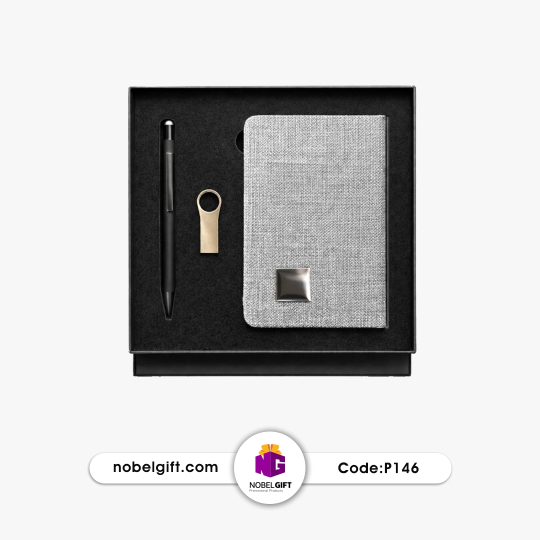 - رنگبندی خاکستری پارچهای + طلایی براق (جلد دفترچه و جزئیات فلزی طلایی) حس مدرن، حرفهای و لاکچری میدهد و یکی از زیباترین و پرطرفدارترین ستهای تبلیغاتی نوبل گیفت برای هدیه به مدیران، مشتریان ویژه، همایشها، نمایشگاهها، بانکها، شرکتهای IT/مشاورهای یا کمپینهای برندینگ سطح بالا است.