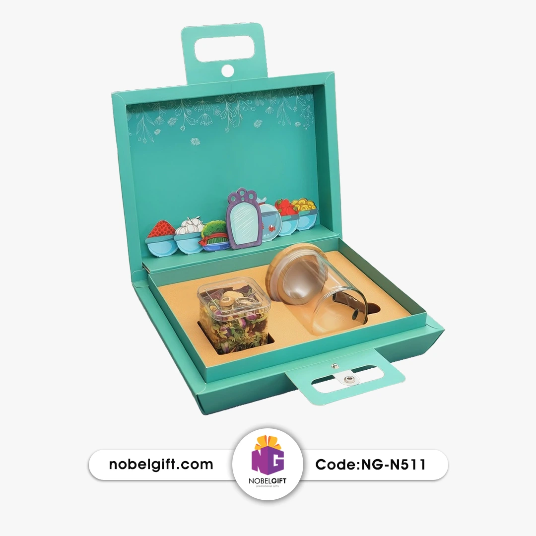 - همه این اقلام در یک جعبه هدیه نوروزی با طراحی شاد و الهامگرفته از المانهای ایرانی قرار گرفتهاند که حس عید و بهار را بهخوبی منتقل میکند.