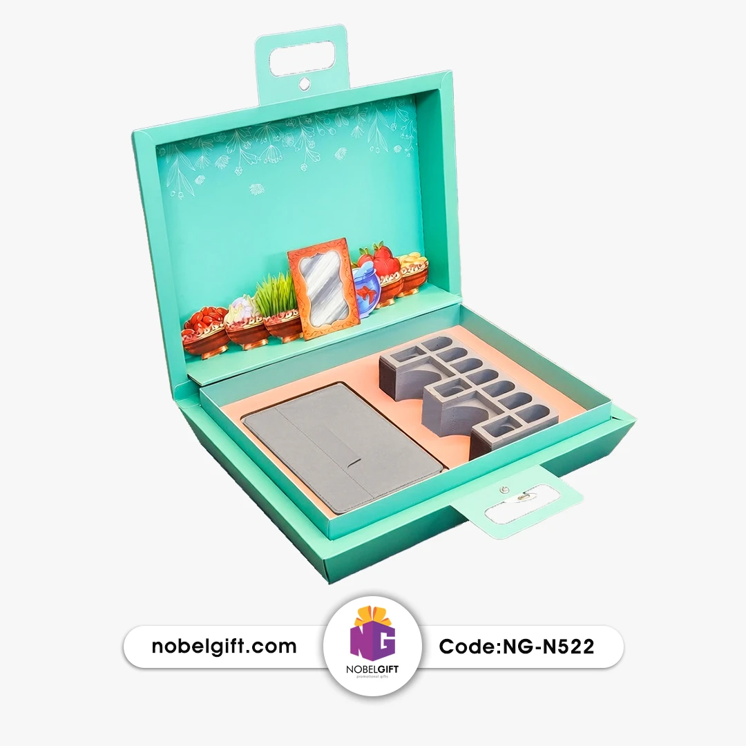2. این ست با بسته‌بندی نوروزی چشم‌نواز و طراحی الهام‌گرفته از المان‌های سنتی ایرانی، حس احترام و ارزشمندی هدیه را به‌خوبی منتقل می‌کند.