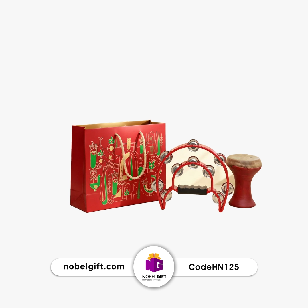 - داخل جعبه یک تمبک چوبی قرمز دیده میشود؛ ساز کوبهای کلاسیک ایرانی که صدای گرم و ریتمیکش یادآور دورهمیهای عید است. کنار آن یک دایرهزنگی (تامبورین دستی) با بدنه قرمز قرار دارد که برای ایجاد ضربآهنگهای شاد استفاده میشود. این دو کنار هم یعنی «نوروز با ریتم».