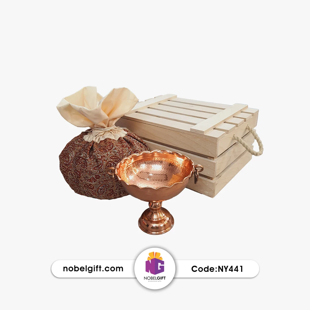 - ست هدیه صنایع دستی NY441 شامل آجیلخوری مسی و باکس چوبی، لوکس و فرهنگی