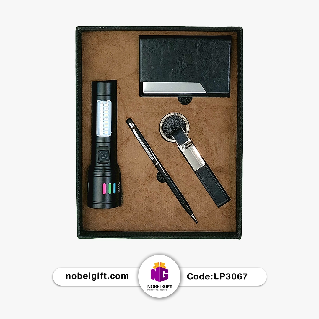 - این ست شامل یک چراغقوه LED چندکاره با نوردهی مناسب، یک خودکار فلزی خوشدست برای نوشتار روان، یک جاکلیدی شیک و مقاوم و یک جاکارتی/جاکارت ویزیت چرمی است.