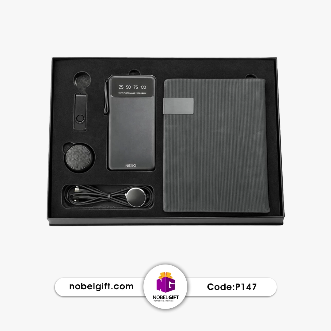 • ست ۵ تکه تبلیغاتی لوکس دیجیتال-اداری (پاوربانک NEXU + اسپیکر بلوتوثی + دفترچه + کابل + جعبه)