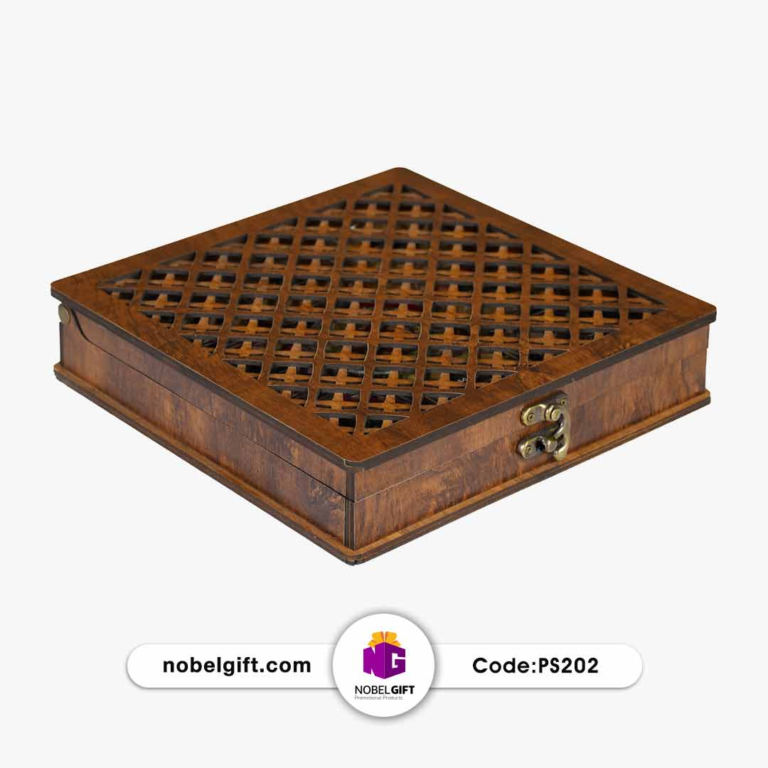 ست هدیه PS202، ترکیبی موفق از بستهبندی فاخر چوبی و اقلام خوراکی مغذی است. ترکیببندی ۹ محفظهای، بهخصوص با مرکزیت متمایز، از نظر بصری جذاب بوده و امکان چیدمان هنرمندانه محتویات را فراهم میکند. چوب باکیفیت و طراحی مشبک درب، سطح تشریفاتی هدیه را ارتقا میدهد. این ست برای برندهایی که به دنبال یک هدیه کلاسیک، کاربردی و با ارزش مصرفی بالا هستند، انتخابی ایدهآل است.جدول مشخصات فنی ست هدیه PS202