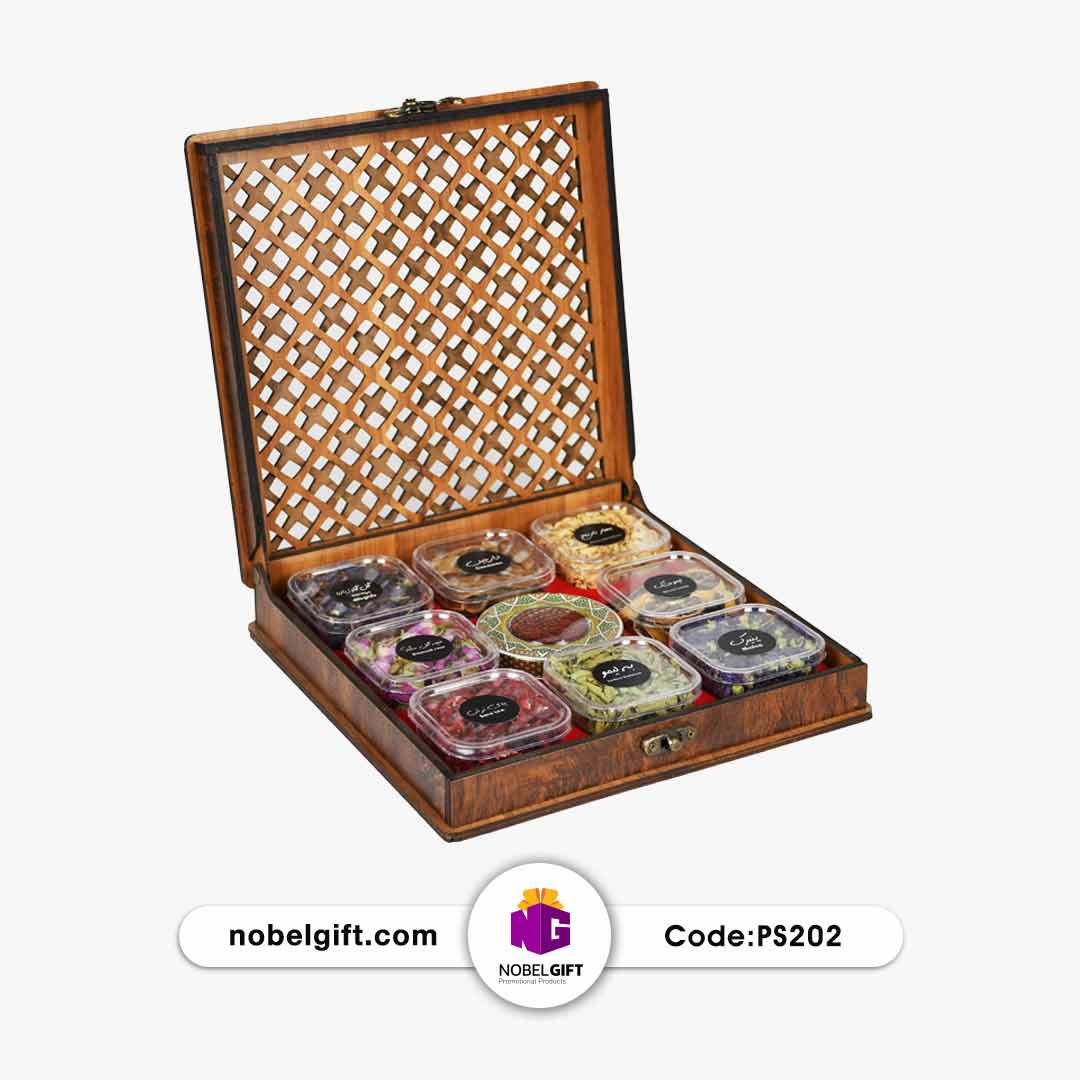 سفارش ست هدیه پذیرایی آجیل و زعفران کد PS202 از نوبل گیفت