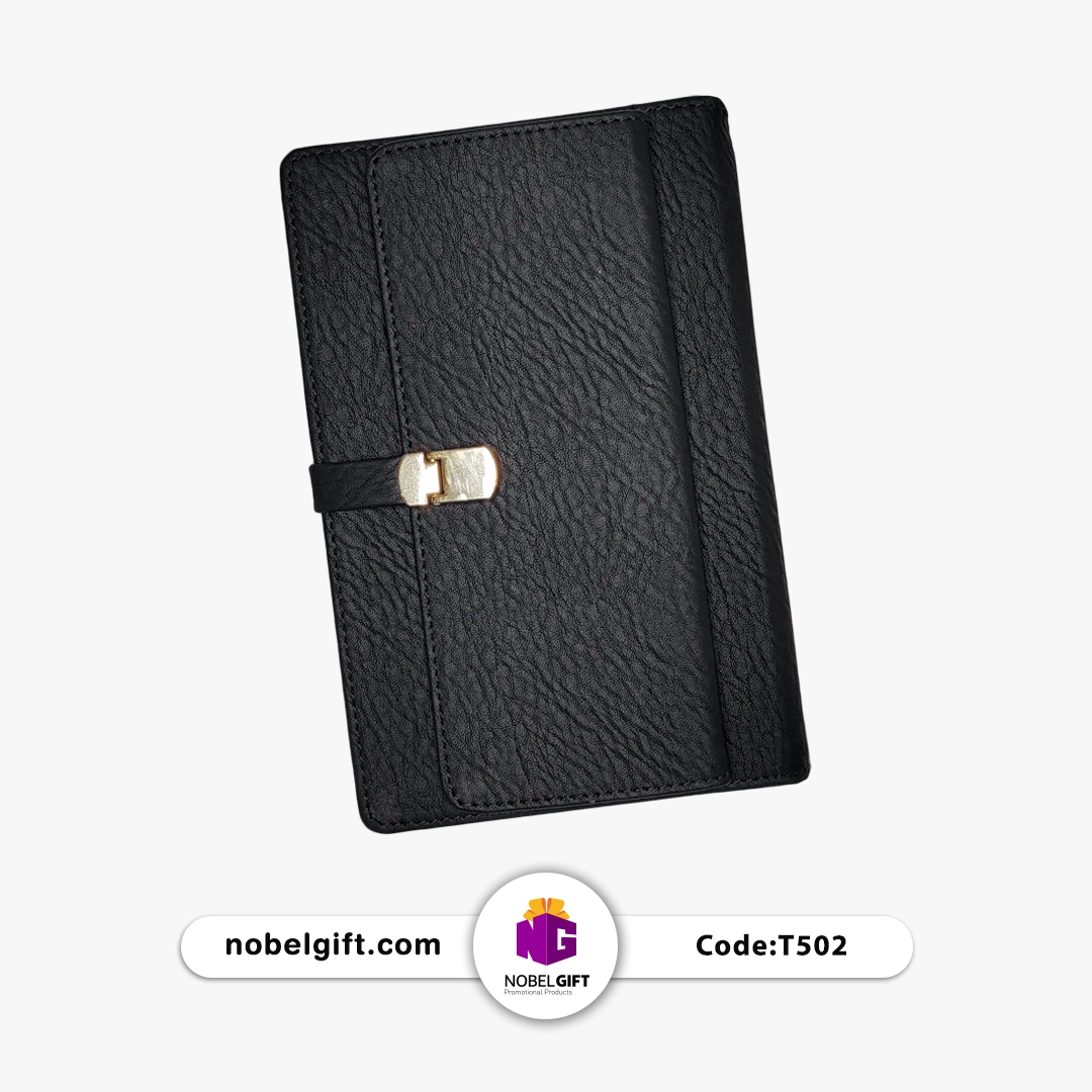 4. رنگ مشکی زغالی: استفاده از رنگ مشکی مات در جلد، تضاد زیبایی با قفل طلایی ایجاد کرده و به محصول هویتی لوکس و مدیریتی بخشیده است.