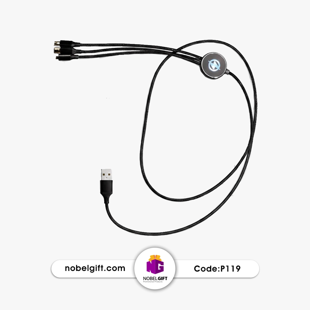 - کابل نازک و انعطافپذیر مشکی (طول کلی حدود ۱–۱.۲ متر وقتی باز شود)، دیسک مرکزی گرد پلاستیکی/فلزی مشکی با لوگوی نورانی یا حکاکی (Nobel یا سفارشی)، سه شاخه کابل کوتاه از دیسک بیرون میآید و هر کدام سر متفاوتی دارد. مکانیزم retractable (کشویی/یویو مانند) برای جمع کردن سریع کابل بدون درهمپیچیدن.
